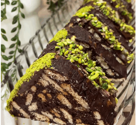 Bisküvi hariç bütün malzemeler bir kaba alıp çırpıyoruz. En son eritilmiş tereyağını ekleyip karıştırıyoruz. Bisküvilerimizi çok ufak olmayacak şekilde parçalıyoruz. Hazırladığımız sosun içerisine döküp alttan üste olacak şekilde çok ezmeden karıştırıyoruz. Bir tepsiye streç film seriyoruz. Ve hazırladğımız karışımızı döküyoruz. Streç filmin yanlarını kapatıp elimizle üçgen şeklini veriyoruz. Daha sonra her yerini kapatıp buzlukta 1,5 2 saat bekletiyoruz. Buzluktan çıkardıktan sonra dilimliyoruz ve eritilmiş çikolataya batırıp daha sonra fıstık tozuna batırıyoruz.